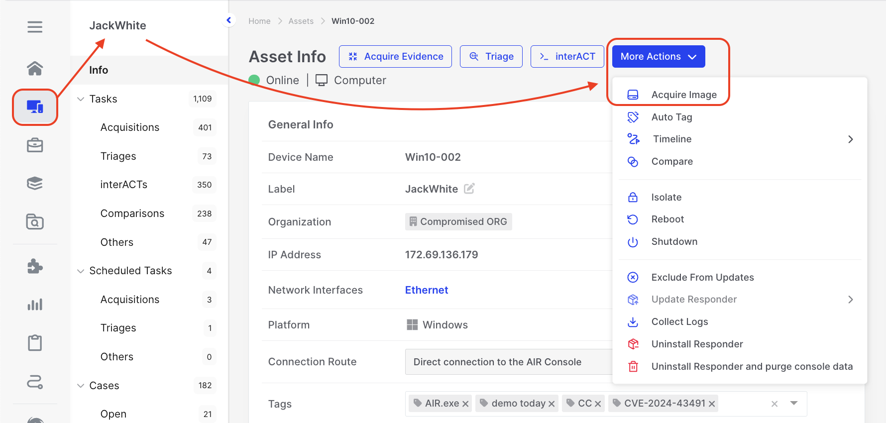 In the AIR UI, select Assets from the Main Menu, then navigate to Devices and select the asset you wish to image. In the Asset Info window, click the Asset Actions button to reveal a drop-down menu listing the actions available for that asset. Acquire Image is one such option: