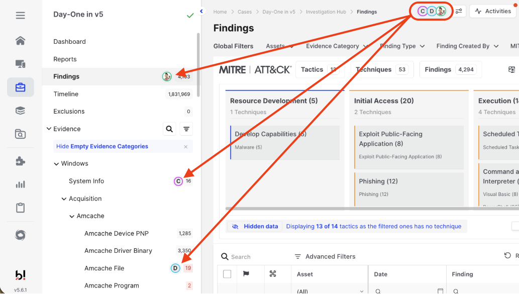 In the Investigation Hub screenshot above, three users are active in this case. Their profile icons show not only who is present but also where each person is working in real time. One user is viewing the Findings page, another is in System Info, and a third is examining the Amcache File evidence. This gives immediate visibility into team activity and helps prevent duplicated effort during collaborative investigations.