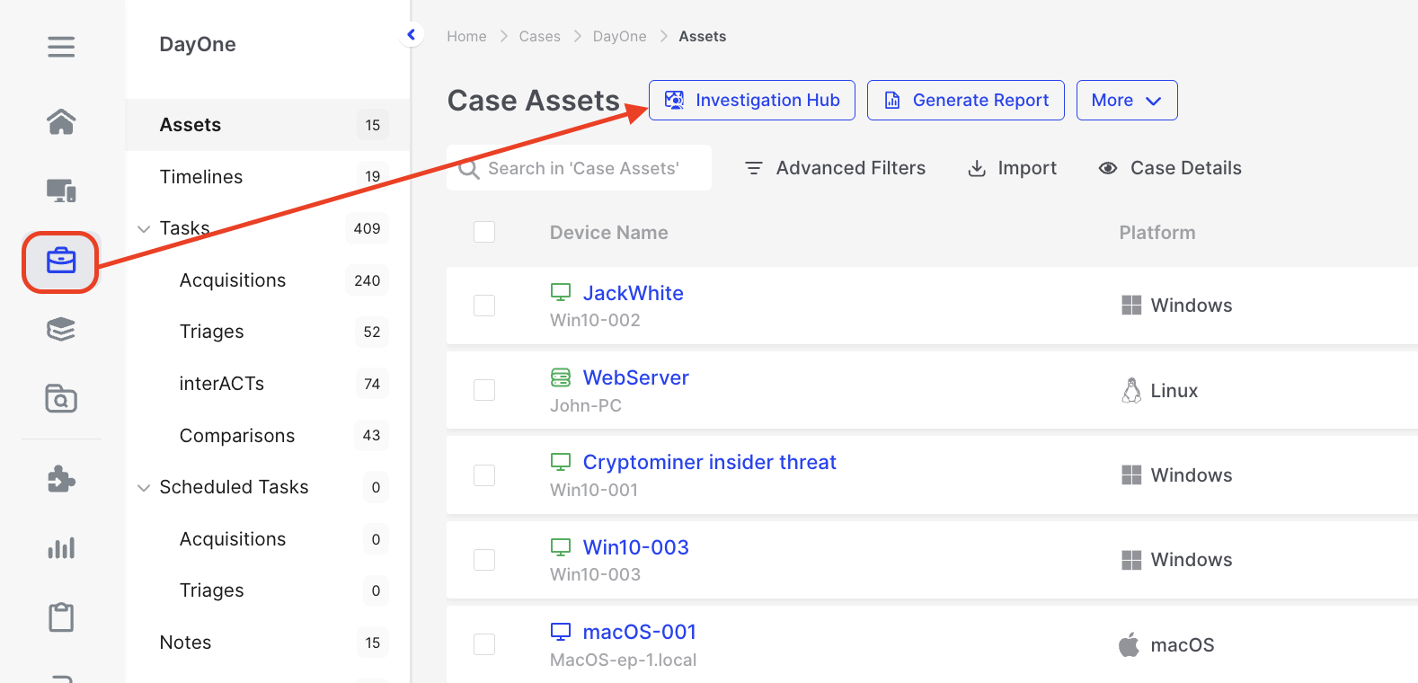 The Investigation Hub offers a unified and well-organized view of assets, evidence, artifacts, and triage results within a case. This allows you to efficiently review and concentrate your investigation on pertinent details using filters and a powerful global search function, eliminating the need to switch between screens to piece data together manually.