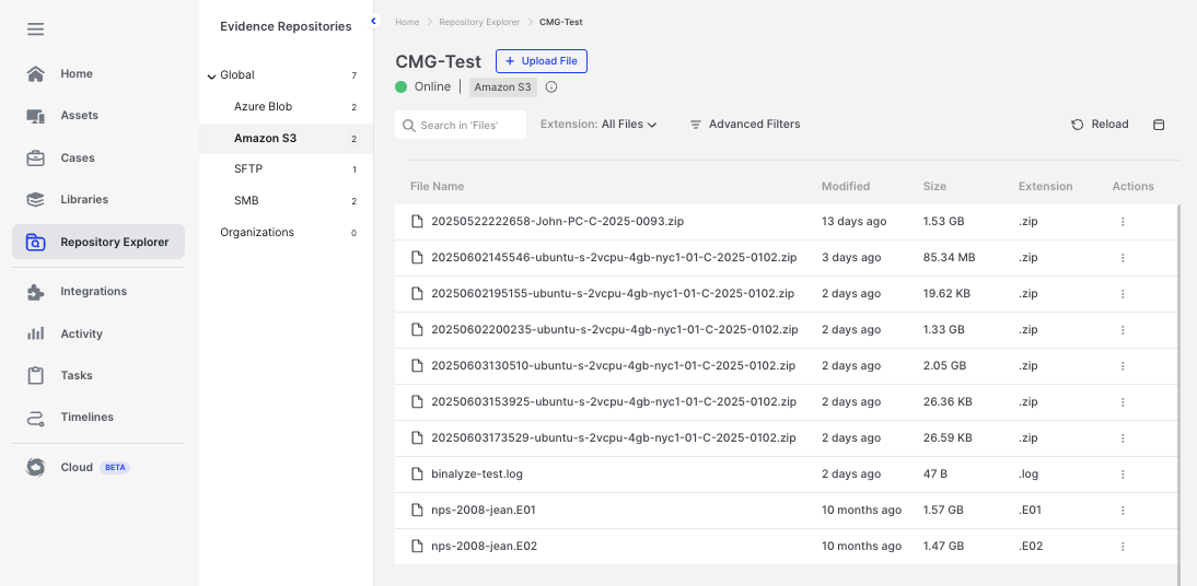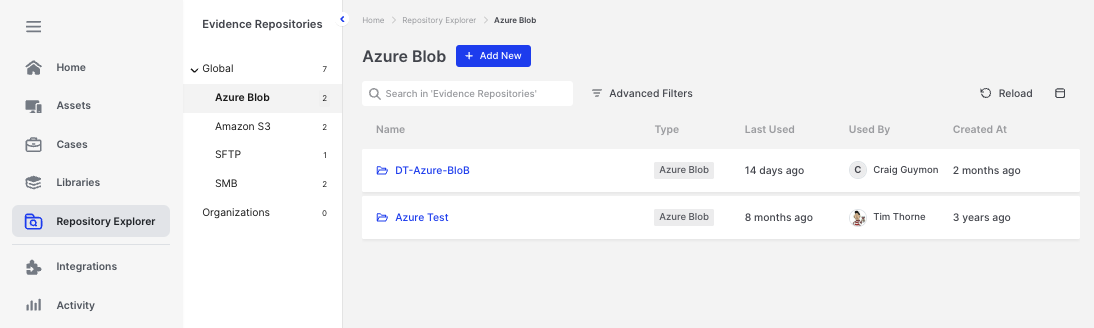 The Repository Explorer centralizes access to and management of all data stored in connected external Evidence Repositories.