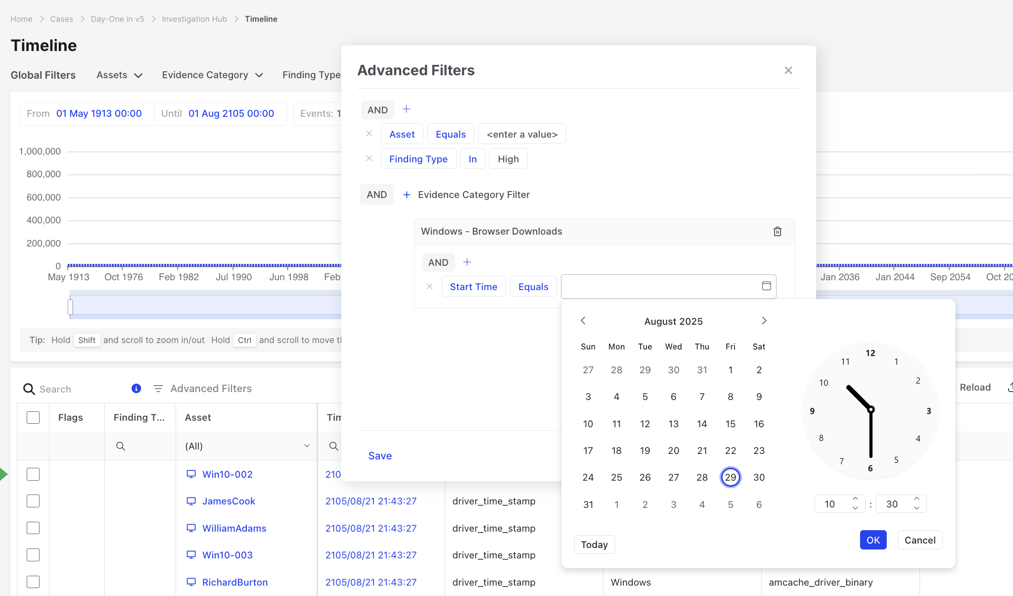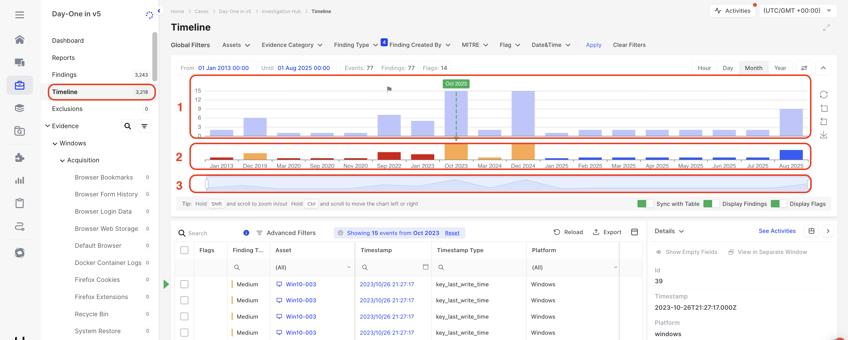 1. Global filters (e.g., Assets, Evidence Category, Finding Type) apply to the entire Investigation Hub, including the Timeline.