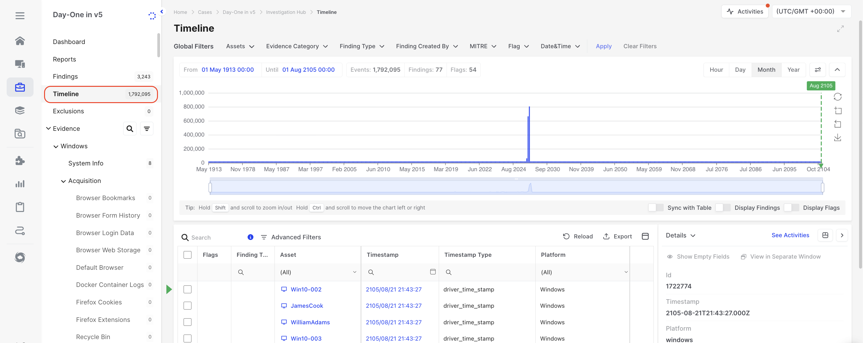 Analysts can apply both global filters (date ranges, assets, evidence types) and evidence-specific filters (e.g., IP addresses, paths, user IDs). This allows precise targeting of relevant events without visual clutter.