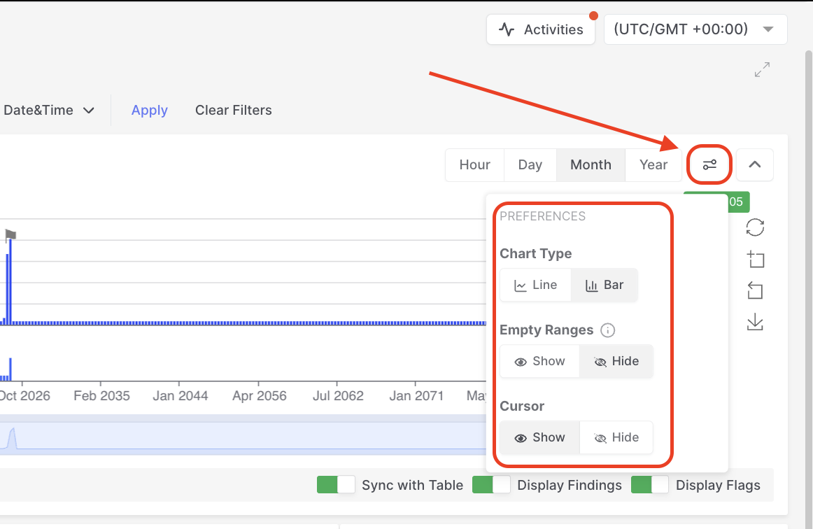 The timeline bar includes several layout and display options to help analysts tailor the view to their investigation. You can switch between bar and line chart modes, show or hide empty ranges to create a more compact timeline, and toggle the cursor for precise navigation. These preferences make it easier to adapt the visualization for complex investigations or when working with large volumes of evidence.