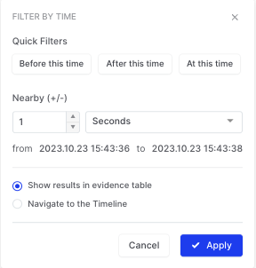 Clicking on a timestamp opens the Filter by Time dialog, which provides quick and precise options to refine the investigation window: