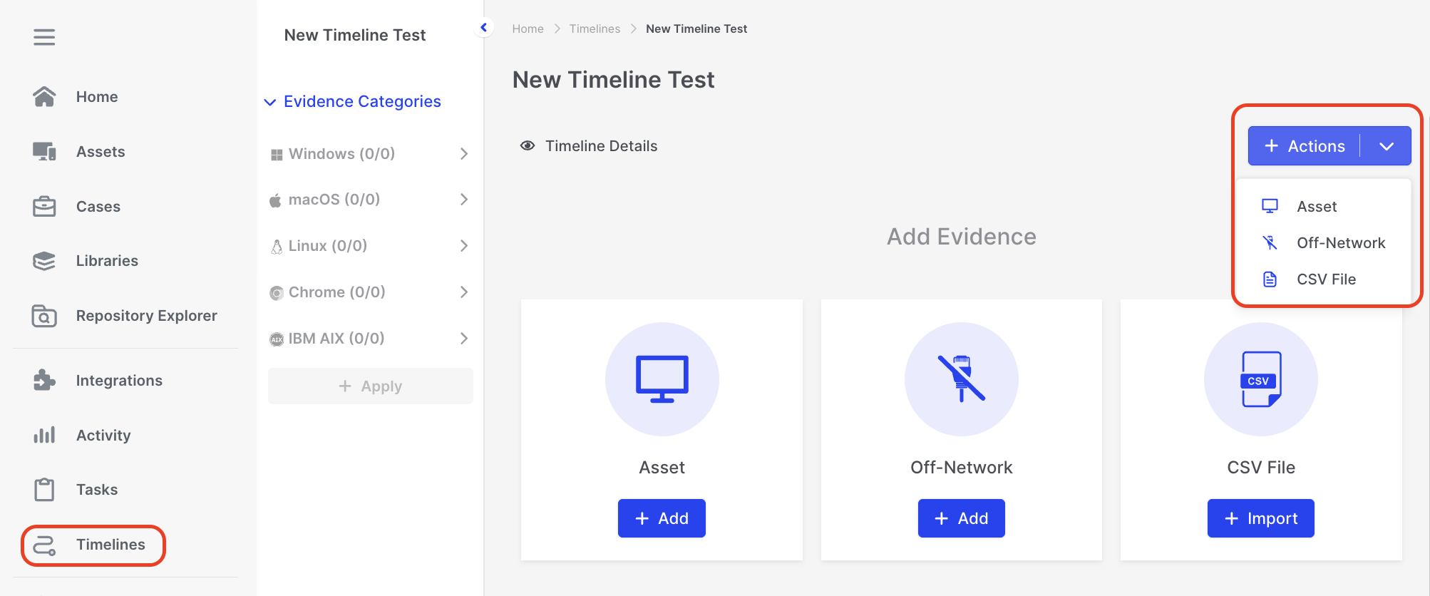 The New “Timeline” then gives you the option to ‘Create with selected assets’ or ‘Create an empty timeline and add evidence later’