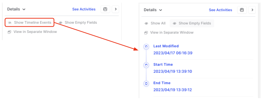 • Within the Investigation Hub, selecting an evidence item in the evidence table opens the Details panel. Here, the Show Timeline Events option reveals all timestamps associated with that item. For example, if the artifact includes a Last Modified, Start Time, and End Time, each of these values will be displayed in this view, and these additional timestamps can themselves be subjected to further relative timestamp filtering.