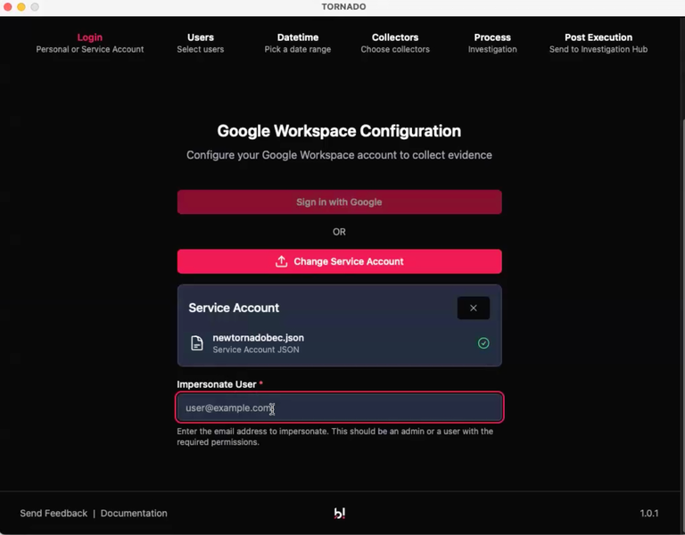 Two authentication methods are available for conducting cloud forensics with Binalyze Tornado for Google Workspace. Each provides different levels of access and data collection capabilities.