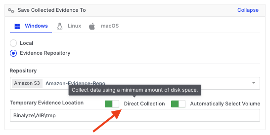 AIR has an option for Windows, macOS, and Linux AIR responders to transmit evidential collections directly to external evidence repositories, thereby efficiently minimizing the utilization of local disk space: