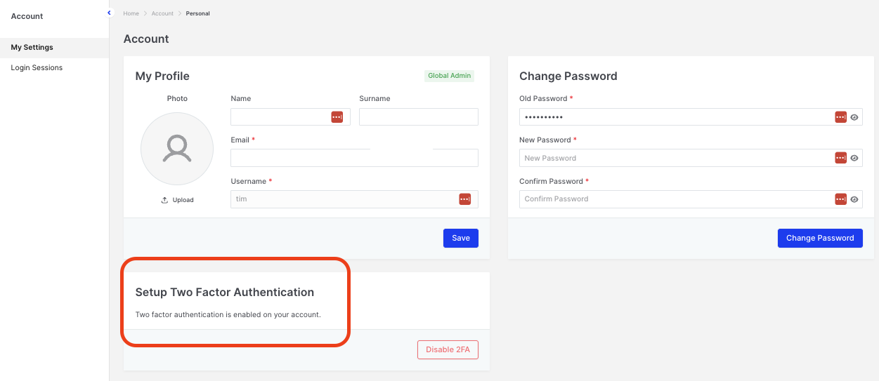 - Individual 2FA Setup and Reset: Users can enable two-factor authentication (2FA) independently in ‘Account > Setup Two Factor Authentication’. Global Admin and users with the “user update” privilege can reset 2FA.